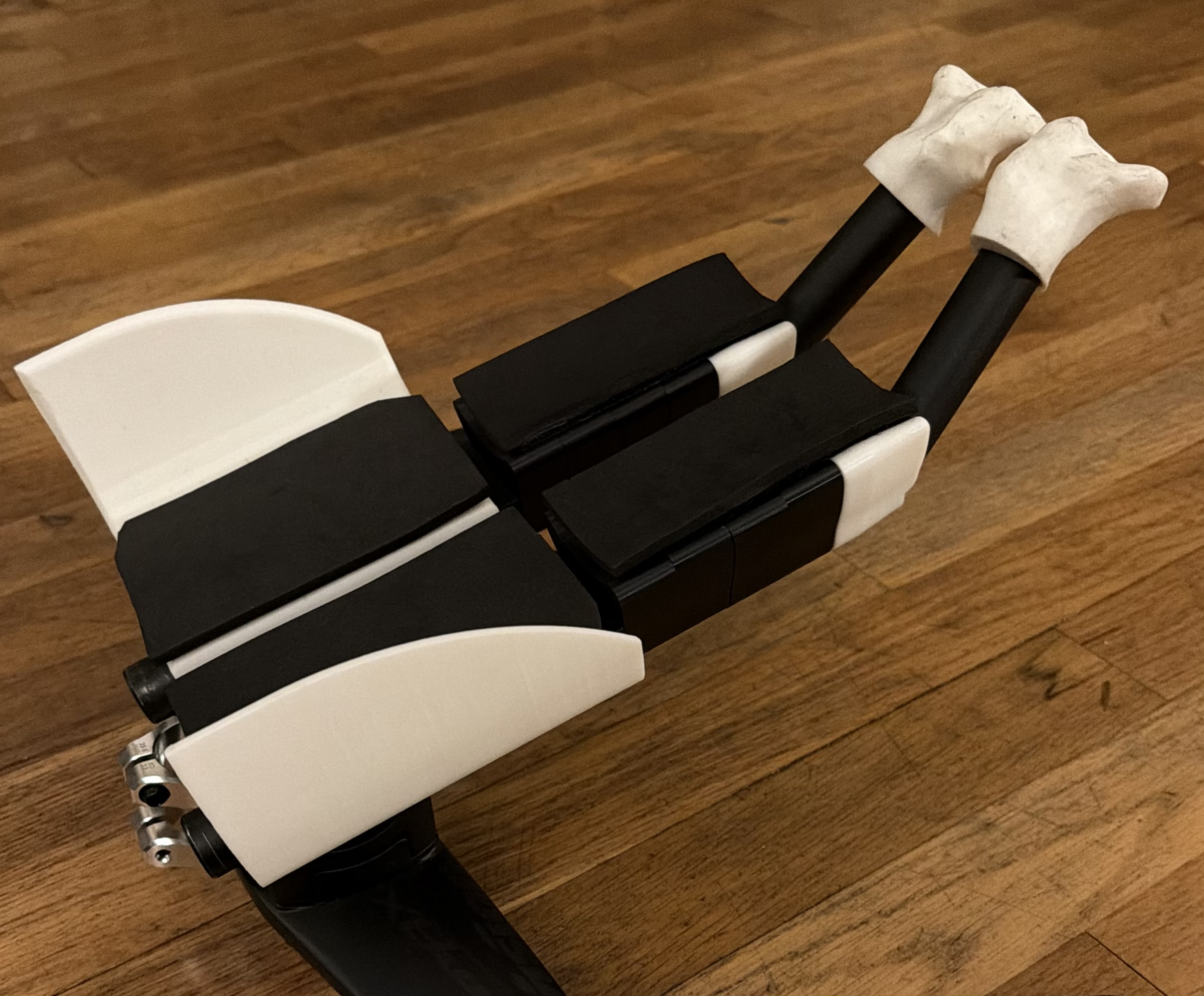 The primary recommended printed material is ASA. The parts are designed to be printed with very thick walls and I have had luck with some parts printed in PLA, ASA is recommended due to its UV-Resistant properties. The whole kit is about half a spool to print. Brass inserts are inserted via a soldering iron and forearm gap fillers are kept in line via 2x 4mm aluminium rods.